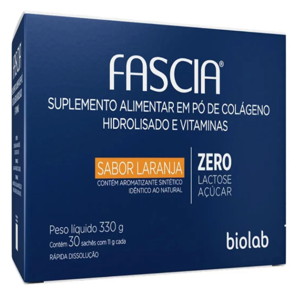Fascia é um suplemento alimentar em pó à base de Peptídeos de colágeno associados a antioxidantes e biotina que auxiliam diretamente na saúde e aparência geral da pele. Sem lactose, glúten ou açúcar, ele contém aromatizante sintético sabor laranja idêntico ao natural e está disponível em embalagem com 30 sachês de 11g cada.