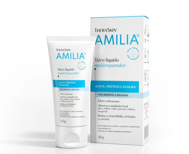Aplique o Talco Líquido Amilia TheraSkin 80g diretamente na pele limpa e seca, nas áreas mais propensas ao suor, como axilas, virilhas e pés.